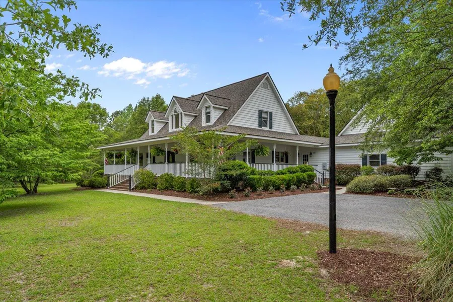 Nestled on 27.5 acres and surrounded by Francis Marion Ntl Forest, this custom built 5 bedroom, 5 bathroom retreat is enveloped in natural beauty. The 'little home' on 507 Leatherwood is also listed and can be sold separately or combined with the 'big home' at 524 Leatherwood. With a large front pond glistening, fully stocked and surrounded by American flags, this home is the epitome of country living at its finest. You enter the property on a winding road lined in oak trees, all hand-picked and planted by the owner. Enter the front door via the 8 ft wide wrap around porch with lush hanging baskets that stay fully watered by automatic well irrigation lines.Home has a formal dining room, large family room with brick wood burning fireplace, awesome country gourmet kitchen, kitchen breakfast nook, and added sunroom. The master suite is on the main level and has lots of lounging room and exquisite walk-in closet, complete with custom carpentry and cedar wall. The Master bath has dual vanities with granite tops, jetted tub, and separate walk-in, tiled shower. There is also a guest bedroom on the first floor with bay window and EnSuite bath that would make an equally impressive office. Two equally large-sized, light-filled bedrooms with copious storage closets are located on opposite sides of the 2nd floor. The rooms are connected by hallway/balcony that overlooks the great room below and a full guest bath. A large garage apartment is perfect for long stays of friends and family or could be closed off from the main house and used for rental income. The first floor houses a kitchen/dining area with loads of cabinets. Upstairs you'll find a large open living area, bedroom and full bath separate doors to living and bedroom spaces for privacy. A full length closet off the living room houses a full-sized washer and dryer and plenty of additional storage space. The attached garage is HUGE and presently houses a workshop, multiple refrigerators and freezers, and gun safe... and there's still plenty of room for two utility vehicles to park plus storage and an additional storage 'garage' on the side for storing pool and other outdoor equipment. A perfect retreat to call 'HOME' Five ponds with manicured landscaping plus wooded areas perfect for hunting and a creek running through it all! Enjoy gentle breezes and magnificent sunsets from the rocking chair on your porch. All of this, yet only a 20 minute drive to Mount Pleasant shopping, dining, and beaches. You can have it all.