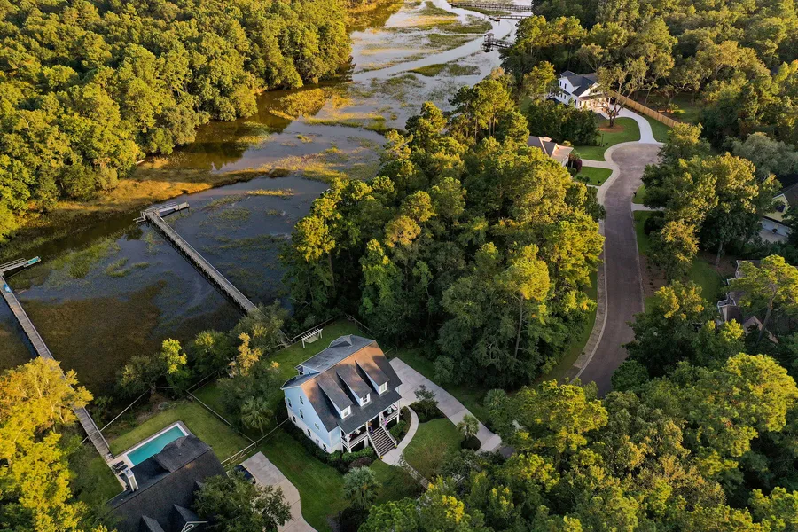Welcome home! This spacious stunner sits on a cul-de-sac and boasts a private dock on Martins Creek on the Wando. Tucked away and yet located just minutes from Mount Pleasant beaches and downtown Charleston. As you ascend the front steps, you are greeted by a beautiful Lowcountry front porch. Inside, an open foyer with half bath to your left and dining room to your right are adorned with wood-trim and wainscoting. Enter the natural lit great room with gas fireplace and surrounding built-in bookshelves and cabinetry. Enjoy your incredible chef's kitchen with Subzero refrigerator, Wolf 6 burner gas range, oven and hood vent, second oven, built-in microwave, wine fridge, porcelain farmhouse sink, large accent island with granite countertops, and an eat-in kitchen with beautiful water views.Off the great room, your first floor owners suite boasts a tray ceiling, dual vanities, tiled walk-in shower, garden tub, and two walk-in closets. Beautiful hardwood stairs with open wrought iron pickets lead you to the second story with a large loft and a perfect bonus area for a children's hideaway playroom or additional storage. Off the loft, you will find three spacious guest rooms. One overlooks the river, one offers an entire room for storage and the last a private bathroom. A third full bathroom and office/5th bedroom also reside on the second floor. This elevated construction home offers over 1300 square feet of storage below! A three car garage bay, two closed storage spaces indoors (one 3'x6' and one 12'X15') and two large storage bunkers located outside of the garage. Relax in your large screen porch or soak in your hot tub on the back deck. Nap in a hammock, warm up by the fireplace or take a stroll down your private dock and lower your boat in to head out for a day on the Wando and see the Charleston Harbor. This home really does have it all from expansive views, amazing water access, storage space galore and prime location. If you are looking for fine Charleston living, you've found it.