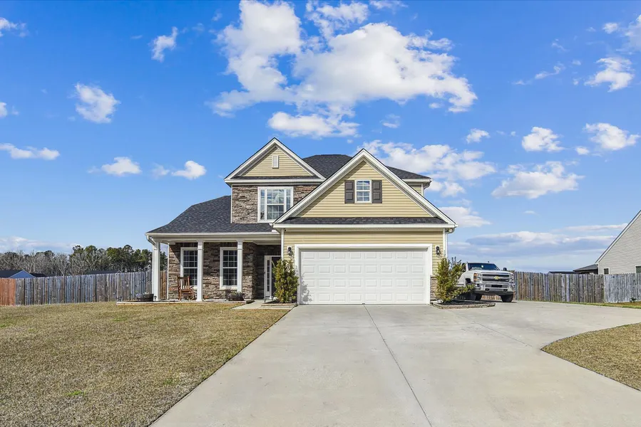 Located in a charming new community, this rare property offers the tranquility of the country yet provides all the city comforts close by. This 2019 home awaits on a sprawling .69-acre lot nestled in the highly desired Cooper Estates - located close to I-26, Lake Moultrie, Cane Bay Plantation dining & shopping as well as Nexton. Looking to entertain? Your guest will admire the openness & grand feeling of the main living space with lofty ceilings. They'll have more than enough room to gather inside & out. Your backyard is fully fenced for privacy & will make the perfect place for celebrations, maybe a pool if you'd like & of course your four-legged family members. Have an RV? There's a special space to park and hook up to your own 50 AMP service.Upon arrival, you'll find a beautiful home with great curb appeal, a large lot with plenty of room between your neighbors, ample parking, and handsome stonework adorning the facade. Your front porch with greets you with columns and space for plenty of rockers - it will make a great spot for sipping on your morning coffee or unwinding with an evening glass of wine. Once you pass through the front door, you'll notice a proper foyer featuring luxury plank flooring, tray ceiling detail, and a neutral color palette that runs throughout the entire home. Immediately to the left, you'll find a spacious, formal dining area and to your right, access to the laundry room which features optional cabinetry, and access to the two-car garage. Continue straight ahead and prepare to be impressed. Enter the main living space where the ceiling height soars to give this great room an airy and bright feel. This is where you'll find the kitchen, eat-in kitchen area, sun room as well as the living room. This spacious great room is anchored by a lovely fireplace that will fill the room with warmth during the cool holidays. It is also wired and equipped with surround sound sub. The cook in the family will be pleased with the amount of storage in the beautiful cabinetry and pantry. The spacious island with classy granite stone will likely serve as the heart of the home - naturally gathering family and friends. Other highlights of this gorgeous kitchen are the stainless steel appliances, tons of can lighting, an under-mount sink, pendant lighting, and glass cabinet detail. The owner's suite is just around the corner from the main living area as well as a perfectly convenient powder room. Your retreat is spacious and includes a tray ceiling, large window, ceiling fan, and en suite. Your private bathroom has double sinks, granite countertops, tile floors, a water closet, a linen closet, tile surround soaking tub, and glass surround walk-in shower with floor-to-ceiling tile. The walk-in closet is a great size. As you make your way up the stairs, notice solid wood treads. The spacious loft has a view of the great room below and makes the perfect space for an office or play area. Two secondary bedrooms and a full bath are also located on the second floor. The two bedrooms both have ample natural light and are fairly spacious for secondary bedrooms. The bathroom features a large bathroom cabinet with a tub/shower combo, tile floors, and a great transom window. Out back, almost half an acre of your land is surrounded by a privacy fence. Oh, the possibilities! With access through a double glass sliding door from the sunroom, the patio and deck extension are ready for your outdoor furniture and perhaps a firepit and grill. You'll easily move any outbuildings into the backyard through the double gates leading from the driveway extension. Please note: The shed and play-set do not convey.