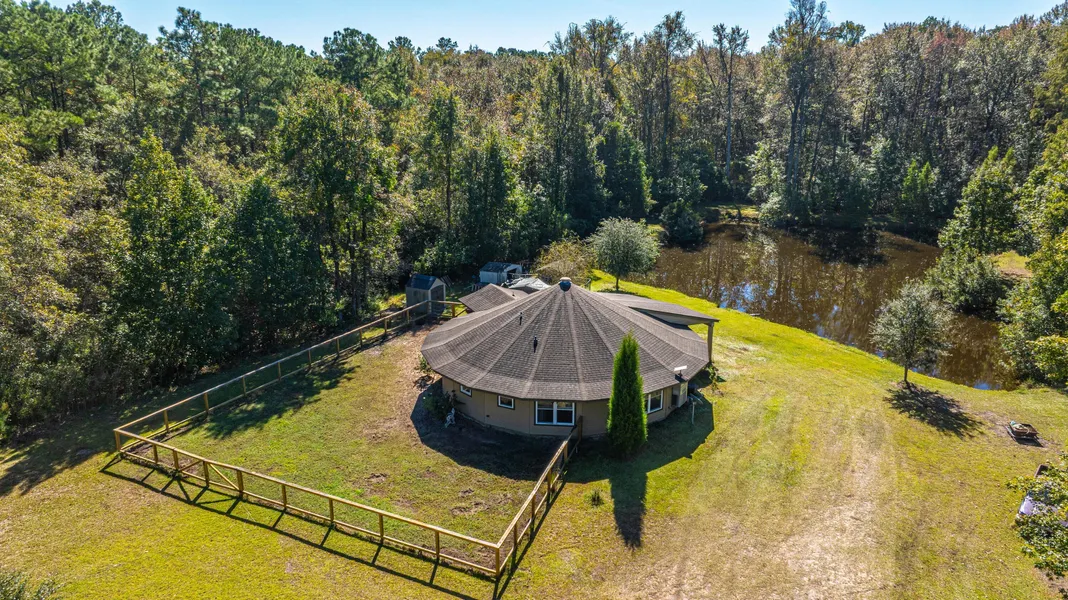 This DELTEC- home offers a rare combination of architectural character, privacy, and energy efficiency set on 1.51 ACRES with its own Private POND! The home also qualifies for 100% FINANCING with no PMI!! Designed for strength, comfort, and sustainability, this distinctive round home embraces Deltec's an open floor plan, abundant natural light, and EXCEPTIONAL ENERGY performance. The interior features light-filled living areas and a spacious open layout, making the home ideal for entertaining or peaceful everyday living. The surrounding land offers endless possibilities! Start a garden, raise animals, or enjoy the included chicken coop, which can convey with the sale. Built with a focus on efficiency, the circular design minimizes heat loss and maximizes airflow!With no HOA or restrictions, you'll have the freedom to customize your property and live the way you choose. Making it an affordable opportunity to own a truly one-of-a-kind property in the heart of Huger.