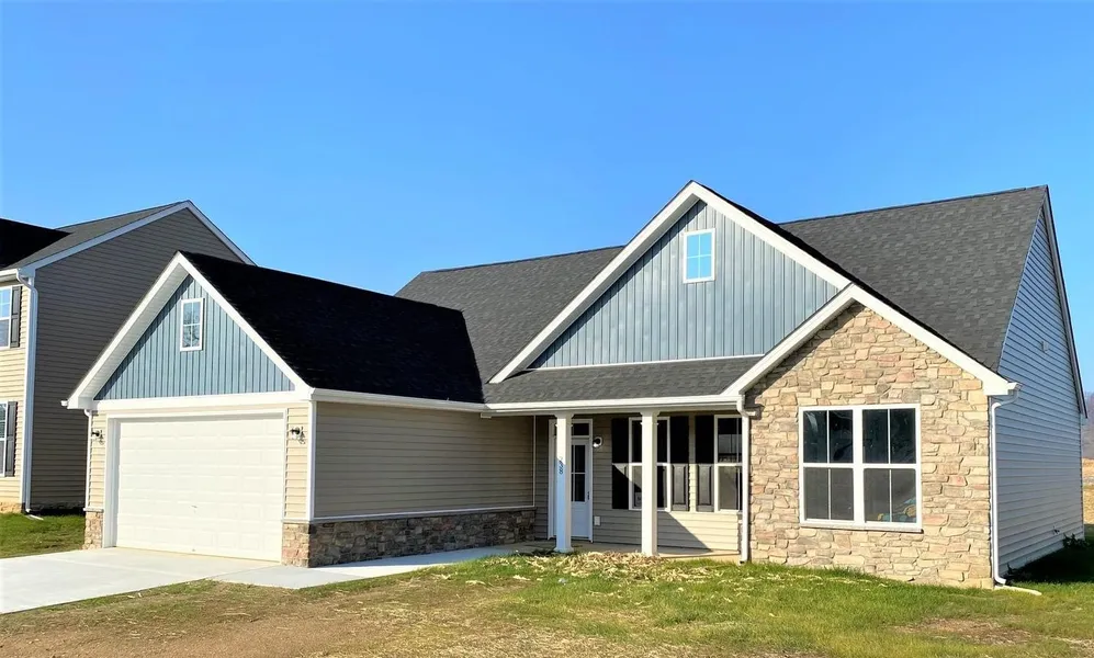 To Be Built with great views....Just over 1600 sqft rancher offering open floor plan with vaulted ceilings in main living areas, 9ft ceilings in bedrooms, and tray ceiling in Master Bedroom with recessed lights. The Master Bath features 6ft dual head tiled shower and ceramic tile flooring. Kitchen is upgraded with large center island, granite countertops, stainless steel appliances, and upgraded cabinetry including pantry. The 12x12 sunroom has gas fireplace with mantle and stacked stone surround, vaulted ceilings, and opens to rear concrete patio. Front porch, stone on front of home, 2-car garage, and concrete driveway included