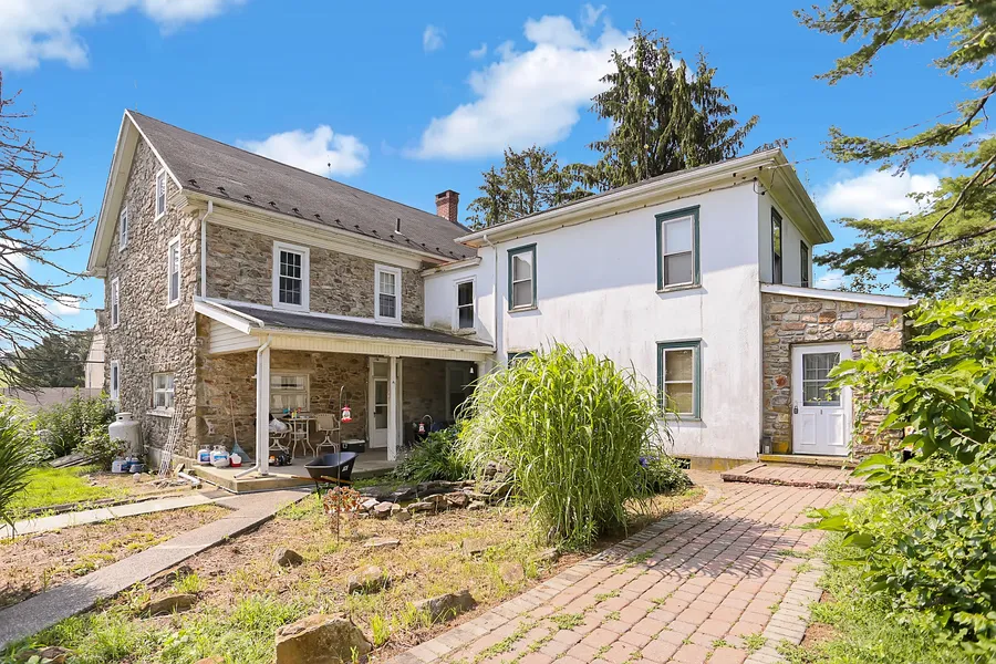 18+acres with large, pointed stone center hall farmhouse circa 1800 with separate home attached by porch. Deep windowsills, wide plank floors, center hall with open stairs, large rooms and lots of storage. Main house has 4 large bedrooms, eat in kitchen, LR, DR, family room, 2nd guest cottage (could be inlaw quarters or rental) has 2 bedrooms, kitchen, dining area and large living room. Several outbuildings, zoned MU/AG, mixed use/agriculture. Land is preserved, located in beautiful Hereford Township, Berks County.
