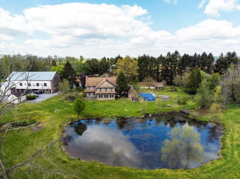 COVERED BRIDGE ESTATES Truly one of a kind! Circa 1781 Farmhouse with a fabulous setting overlooking a pond with stream & preserved farm fields surrounded by hills and woodland. Enter the main farmhouse through the foyer entrance complete with elevator for easy access to second floor. kitchen has huge, stone walk in fireplace, tile floors, Corian counter top, tile backsplash, open beam ceilings, gas stove and built in electric wall oven. Beautiful Stone sun room addition with tile floors & walls of windows with atrium door leading to a patio & Gazebo overlooking the pond, farm fields and streams. Living room has stone fireplace and wall to wall carpeting. Family room with hardwood floors, open beam ceilings deep windowsills and brick wood burning fireplace with stairs leading to second floor. A half bath completes the first floor. Upstairs you will find 4 nice sized bedrooms including a ...