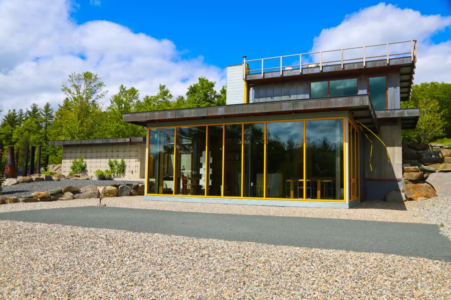 This remarkable Euro-Industrial retreat offers chic, modern country living, with layered spaces, roof decks, top quality construction, and incredible views. Here is sweet seclusion, on 26 acres with a pond, grassy meadow and woods nestled into Mohawk State Forest, just 12 minutes to MassMoCA and 25 minutes to Williamstown. The main house features a living room, kitchen, scullery and pantry, a library/office, first-floor guest suite, and second-floor master suite, while the guest house comprises a living room, two bedrooms, kitchen and bath. A work barn could be become an artist's studio. With unsurpassed attention to detail, the design, materials, and construction incorporate European woodstoves, imported windows and fittings. An incredibly stylish property for the aesthetically discerning buyer.