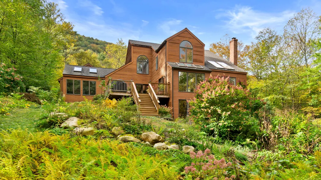 Custom built home on 5 private wooded acres, convenient to Butternut Basin for skiing and or shopping in Great Barrington, Attractive stone stairs at main entry....level entrance to house from attached garage. 4 Bedrooms, 3 baths Living room with fireplace, open dining room, kitchen with granite and stainless appliances. Kitchen is open to a great room and 3 season sunroom. Bedroom and full bath on the main level, second floor includes primary bedroom and bath, 2 additional guest bedrooms and full bath. The lower level is finished and used a family room. Amenites: Oak flooring, marble, granite, heat pump, central air, established gardens, two car attached garage with studio above. Exterior with stained cedar siding, Pella and Andeerson windows and doors. Private well and septic