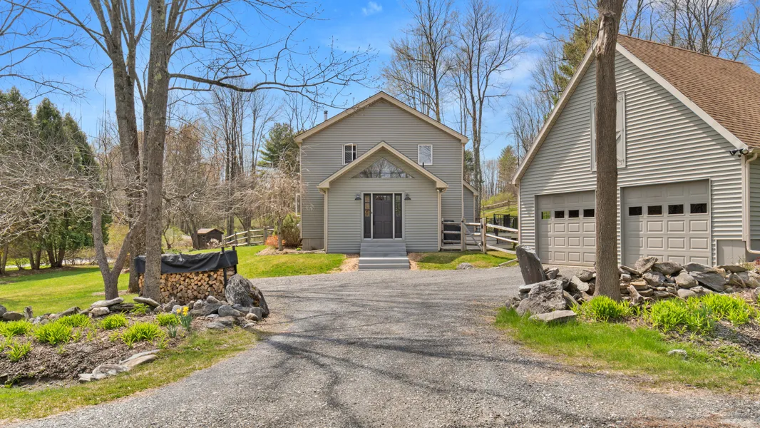 This immaculate light-filled post and beam home is ready to be enjoyed by you. Open plan first floor encompasses living room, dining room and kitchen. Bedroom and full bath also on the first floor. Attractive wood-burning Morso fireplace adds warmth on cooler days. Handsome kitchen with custom wood cabinets. Large stone-floored entry room adds ease to entering the house. Upstairs are two loft spaces which overlook the living area, plus two additional bedrooms and full bath. Decking is composite, and the immaculately manicured yard with beautiful natural rock outcropping is fenced in for your furry friends. Two-car garage with exterior stairs to finishable space above. Large utility shed for yard work supplies and bikes.