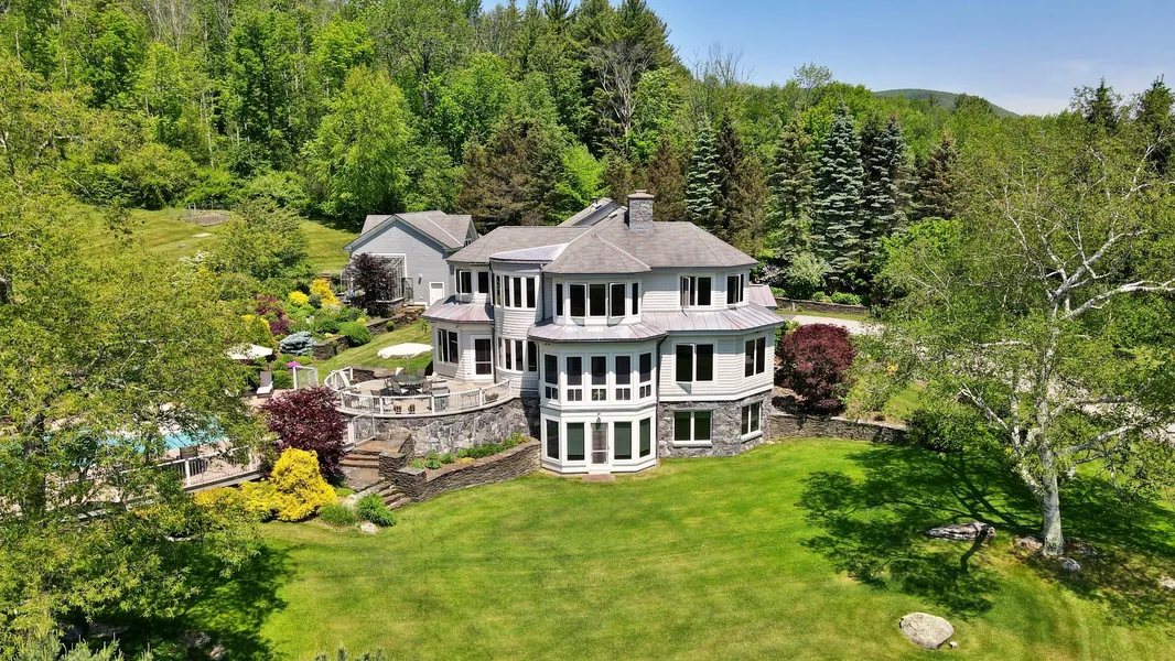 Custom built contemporary home on 15 acres with protected view of fields and mountains. Views from every window! Living room with wood burning fire place, beech flooring and Pella windows, Screened porch, dining room, eat-in kitchen with granite counters, Viking appliances, access to rounded stone patio for outdoor dining. The two car attached garage leads to; mud room, laundry/powder room and storage closets. The second floor has 3 guest bedrooms and 2 full baths, office, a spacious primary suite with sitting area and view. The lower walk-out level has a game room with wet bar, media room, exercise room, full bath and SAUNA.. The grounds are beautifully landscaped with gardens, stone walls, stone patios, gunite pool and exterior shower. Outbuilding with two car garage, greenhouse and studio.