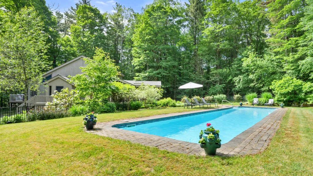 Sunny Contemporary Home with 60' Pool on 1.3 Beautifully Landscaped Acres! Sunlight, privacy, and style. This architect-designed house is exceptionally located in a light-filled lot with a wonderful pool and impeccably kept gardens. This home is move-in ready and allows for one-level living. Relax in the stunning screened porch that overlooks mature gardens and a private backyard. The modern and updated kitchen, with stone countertops, marble floor, stainless steel appliances, opens to a spacious living room with fireplace, dining area, vaulted ceilings, skylights, and a large deck. The first floor primary bedroom features an ensuite bath, large soaking tub, skylight, and fireplace. A roomy office/library has built-in desk and shelving, and access to the front deck. A second bedroom, and adjacent full bathroom, complete the first floor. Upstairs, one finds two guest bedrooms and a jack-and-jill bath. The lower level makes for a great rec room. Stylishly designed, superbly sited, and impeccably kept, this 2530 sq ft property is part of the amenity-rich Otis Woodlands community, which offers tennis courts, pickleball courts, a community pool, clubhouse, private lake, and fitness center. This bright and cheery home is just 25 minutes from Lenox, Lee, Stockbridge, and Great Barrington. Close to all of the beauty and wonders that the Berkshires offer, including Tanglewood, Jacob's Pillow, and many music venues and live theater houses.