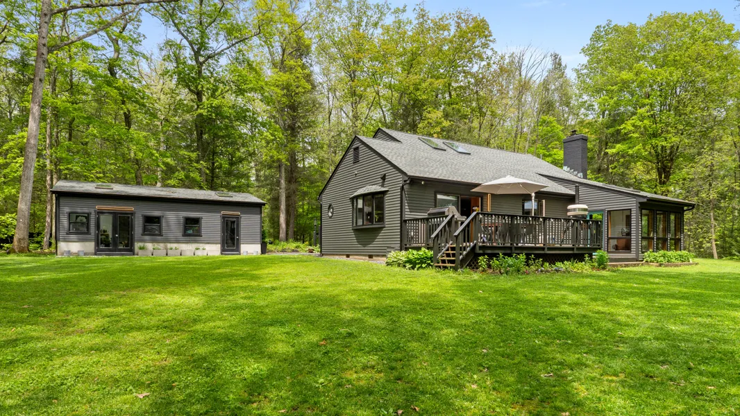 Contemporary Egremont Stunner on 6+ Acres with Artist's Studio! A sleek, design-forward renovation meets total privacy in this contemporary home on 6.3 wooded acres in low-tax Egremont. Set well back from the road amid a green, sun-filled lawn, the property offers sufficient frontage and acreage for multiple lots—providing flexibility to enjoy as-is or explore future build potential. Meticulously renovated over the past four years, the home blends warmth and modern design. The chef's kitchen stuns with custom American Black Walnut cabinetry, quartz countertops, induction cooktop, high-end appliances, and an oversized island with integrated storage. Glass sliding doors open to a spacious back deck—perfect for outdoor dining, grilling, or entertaining. The kitchen flows into a vaulted living room with a stone fireplace, large wood stove, and built-in liquor cabinet, ideal for evening cocktails or weekend gatherings. Just beyond, a step-down sunroom opens directly to the rear yard and offers a relaxed, all-season retreat. The first floor primary suite is both generous and thoughtfully designed. A spa-inspired en suite bath features solid quartz shower panels, a ceiling-mounted rainshower, heated towel rail, a Japanese toilet, and mirrored cabinets with integrated power, dimmable lighting, and built-in steam control. A full-sized washer and dryer are discreetly tucked into the suite for added convenience. Custom closets provide ample storage. Two additional first floor bedrooms, each with custom closets, share a beautifully renovated second bath. Upstairs, a large rec room offers flexible living or sleeping space, while an adjoining loft area makes an ideal open office. A fully heated and insulated detached two-bay garage, built in 2023, includes a finished studio space, perfect for art, music, or year-round projects. Additional features include a programmed robotic mower for effortless lawn maintenance, upgraded spray foam insulation, fiber internet, and two large storage sheds, one for wood, one for equipment. All just minutes to downtown Great Barrington, Catamount Ski Resort, Guido's and Big Y supermarkets, and countless dining and recreational attractions. Modern, tranquil, and completely turnkey.