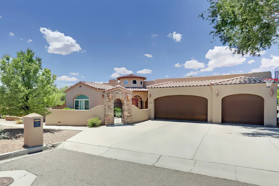 Southwest style, Elegant custom home at end of private street, gated courtyard opens to a turret and foyer style entry, popular open floor plan, two living areas, the great room has a soaring beam style ceiling with custom fireplace, the family room also has a custom fireplace, formal dining area or sitting room plus a 2nd large dining area, private office or 4th bedroom, central island style chef's kitchen, guest bath - powder room, large master bedroom with private access to patio, garden tub and walk in shower, Travertine Tile floors in the living spaces and bath, private back yard with a large covered patio, expanded 3-car garage, landscaped. Great location sought after schools La Cueva, Desert Ridge and Double Eagle, easy access to park, outdoor recreation, local shopping and freeway.