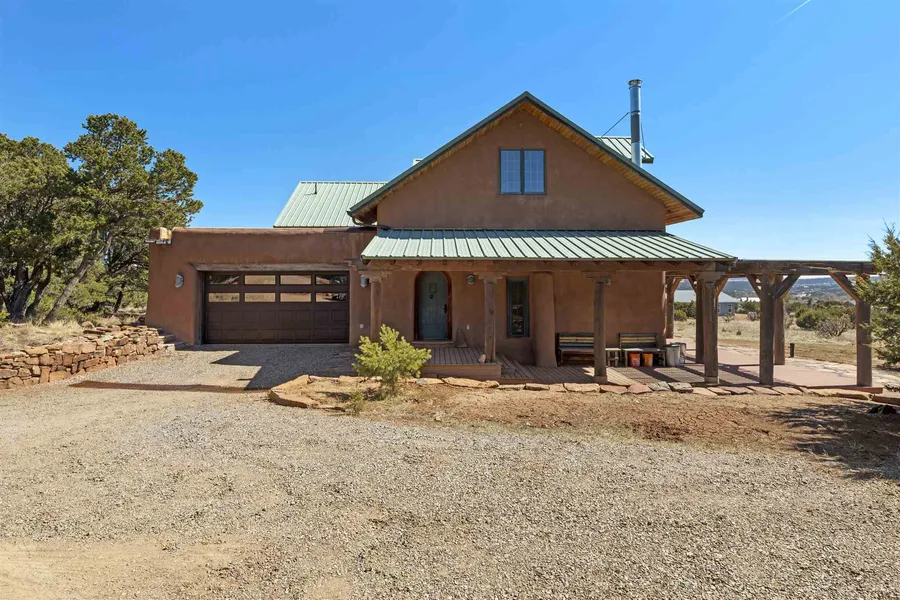 This one-of-a-kind home is privately located at the end of the road on a beautiful 2.8 acre lot. Upon entry into the home, you are greeted into the foyer which steps down into the welcoming kitchen and will immediately be captivated by the beautiful mountain views captured through the kitchen and living room windows. The owners spared no expense in many of the details of this home. The main floor features thick 14 adobe walls with natural adobe mud and straw hand plastered interior walls. Reclaimed 14 x14 Doug-Fir timbers were used for headers, viga decking and kitchen cabinets. Unlike many adobe homes with dark interiors, the 15 ceilings and large picture windows draw in an abundance of natural light to enjoy the beautiful views. Many exterior doors lead to the outdoor spaces including a patio and ramada to enjoy the beautiful NM weather.