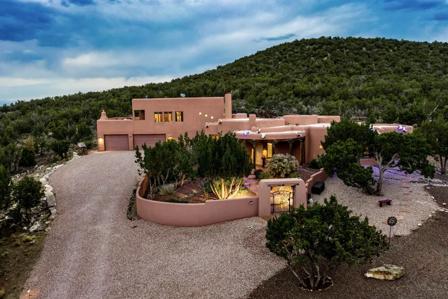 Imagine the night sky full of stars in a sea of darkness. From this custom Rastra block home located on 10+ acres in San Pedro Creek Estates, you can enjoy your privacy and the wide open spaces and sky. From the verdant entry courtyard you step into a thoughtfully designed home with custom high-end finishes and fixtures. The great room offers incredible views and a beautiful kiva fireplace. Shelves line the ceiling to display your art. There is a theater room with hay bale construction to provide incredible acoustics, full theater electronics and seating. The owner's suite is separated from the other bedrooms and features plantation shutters, a spacious dressing room and a luxurious bath with upgraded fixtures, spiral shower with custom rock work. The upgraded kitchen is in the center of the house and features top of the line appliances, pull out shelving, black granite counters, and a charming 2 sided fireplace that opens onto the dining area. The other side of the house offers a 3 car garage, a guest room with ensuite bath on the lower level, and 2 other guest rooms upstairs with luxurious bath and inviting large terrace. Enjoy this tranquil location, 5 minutes to world class golf at Paako Ridge, 30 minutes to Albuquerque, 45 minutes to Santa Fe. Seller will include a social membership to Paa Ko Ridge Golf Club with a successful sale. #1 golf course in New Mexico and #47 in the United States visit https://paakogolf.com/.