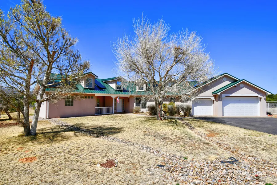 Stunning single level home with fully owned solar system on 3 acres in the desirable Richland Estates neighborhood! Open floorplan that leads out to a private backyard area with covered patio, plenty of space for entertaining and VIEWS of the Sandia Mountains. Large kitchen with custom Halbert cabinets and island open to the dining room. Split floorplan and spacious master suite with fireplace, jetted tub and large walk in closet and separate shower. 3 bedrooms, plus an office or 4th bedroom with glass french doors and kiva fireplace. Recent updates include newer Metal roof(2020), owned solar system with amazing East Mountain perks including community water, No HOA and 3 car garage.