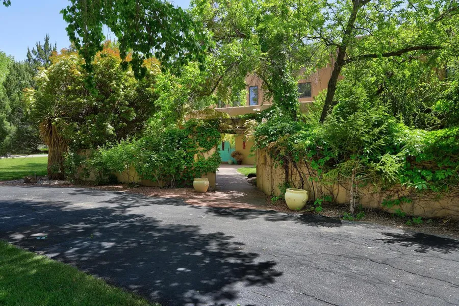 This Magnificent Tinnin Farms Beauty is nestled under a canopy of cottonwood trees in the heart of Los Ranchos. The inviting courtyard leads you to the home's Grand Foyer with a dramatic staircase and soaring ceilings. This spacious home is an entertainers dream offering an updated Chef's Kitchen with nook, a formal dining room, an elegant living room with Kiva Fireplace & Wet Bar, a Cozy Den with a 2-way FP to the Solarium and an abundance of indoor/outdoor entertaining areas! Enjoy tranquility and privacy in the Owner's Suite with Sitting Room, another 2-way Fireplace, Spa Like Bath, Huge closet and a Private Balcony offering Majestic views of the Bosque! Beautiful attached 800sf casita with living room, bedroom, bath, one car garage & private entrance! Owned Solar & Irrigation well