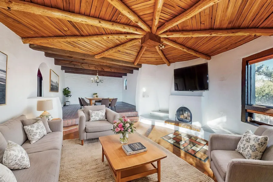 New price! Seller motivated! Look no further for your southwestern family dream home or vacation rental investment property in beautiful Corrales, NM. Incredible, custom, REAL adobe home. 4 bd, 3 ba. 4 fireplaces. 5152 sq. ft incl. enclosed pool area approx. 1500 sq ft. Artist studio space/office, custom masonry, kiva/sunburst ceilings, stained glass windows, large primary suite. With an attached 650 sq. ft 1-bdrm ADU, separate entrance, full bath and kiva fireplace. House sits on .66 acres; the property includes a .72 acre adjoining, vacant lot (1.38 acres total). Ample parking, 4-car garage; large storage area. Ideal location on Albuquerque's west side. Tucked away in a quiet, sweet, rural-like neighborhood, yet close to many shops/restaurants. No ghosts.