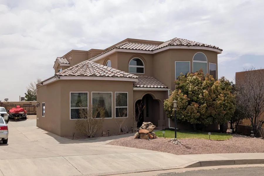 Beautiful custom home in the foothills w/stunning views of the Sandia Mountains & the City. This 3 bedroom with office and 4 bath home offers a spacious living room with 2 Master Bedrooms 1 downstairs and 1 upstairs and 20ft ceilings. Large loft w/fireplace & balcony. Two primary suites with walk-in closets & full baths w/jetted tubs. Third bedroom has on- suite bathroom & 2 walk-in- closets. Large laundry room with lots of storage & laundry sink. Kitchen with island, panty & breakfast area. Over 1000 sq. ft. 3 car oversized garage w/utility sink & AC. Long driveway offers RV parking & RV hookup. 12x20 Storage Shed. New stucco in 2022. Private back yard offers a covered patio as well as open patio space & lush grass. Automatic sprinklers front & back.