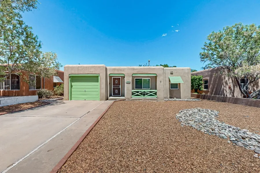 Tucked in the heart of UNM Ridgecrest, this lovingly maintained home blends vintage warmth with thoughtful updates. Original hardwood floors, coved ceilings, and soft natural light create timeless character. The remodeled kitchen offers solid-surface counters, stainless appliances, cast iron sink, Saltillo tile, and a spacious pantry. French doors open to a serene backyard with $10K in landscaping and a shaded patio that invites you to linger. Enjoy a newer MasterCool system, tankless water heater, vinyl windows, and excellent storage in the garage and laundry. Come see where comfort, charm, and character blend in perfect harmony to create a place you'll feel at home.