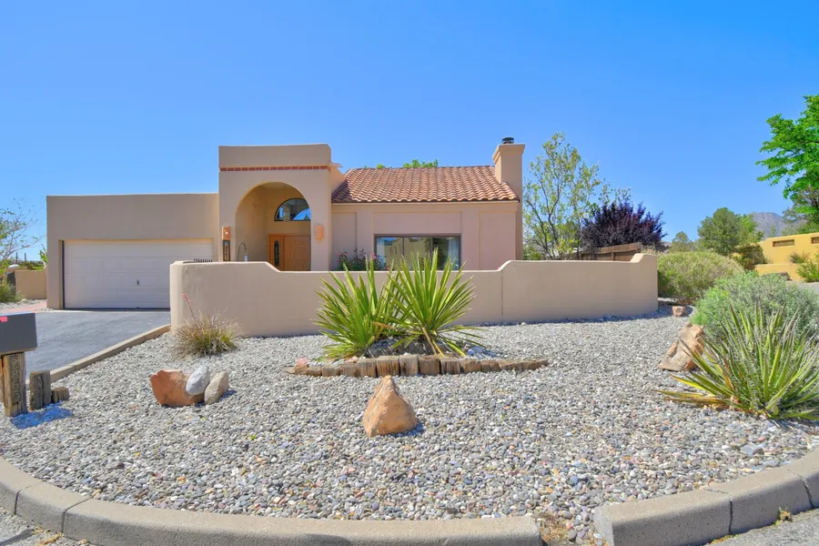 Stunning Single-Level Home with AWESOME City and Mountain VIEWS located in SANDIA HEIGHTS! This home offers 3 bd/2 full bths, 2 living areas & formal dining. Large windows with gorgeous Views and strategically placed skylights allow natural light to pour in. Enter into a warm and inviting living area with a beautiful wood burning fireplace. The family room adjacent to the kitchen makes entertaining a breeze. Large primary suite with access to a sunroom perfect as a private sitting area, home gym, or art studio. One of many upgrades is the 2018 solar installation, seller owned - offering energy efficiency. Home is enhanced w/smart home features, bringing modern convenience & connectivity into daily living. 2 car garage. Close to hiking/biking trails.