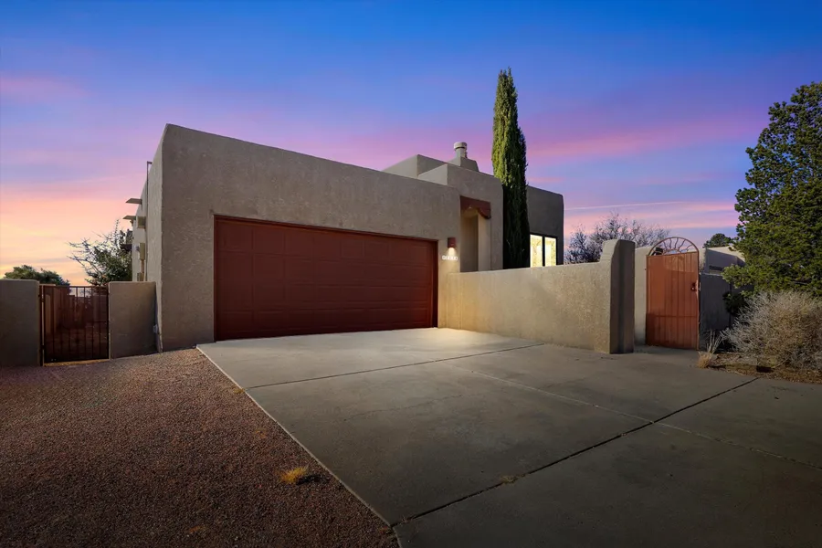 BREATHTAKING MOUNTAIN VIEWS AWAIT IN THIS SANDIA HEIGHTS RETREAT! Step through the charming courtyard entrance into a stunning one-story home where beam ceilings and premium tile flooring create an atmosphere of warmth and elegance. Cozy up by the kiva gas log fireplace in the open living area, with no carpet in sight. The galley kitchen boasts a built-in oven and cooktop. Upgraded Pella windows, two HVAC units, and two hot water heaters ensure comfort year-round. Relax on the covered porch, surrounded by mature landscaping and flowering trees. Just minutes from Elena Gallegos Open Space, this move-in-ready gem won't last. Schedule your showing today!