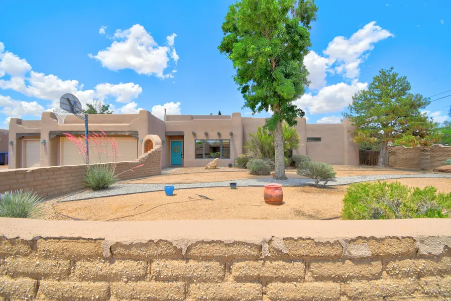 Don't miss this exceptional 3 bdrm/2 full bath-3 car garage custom-built Pueblo Style home. Perfectly situated on a spacious cul-de-sac corner lot in the coveted NORTH VALLEY! Step through the enclosed courtyard into the stunning great room featuring 12-foot beamed ceilings with an abundance of natural light. The updated kitchen opens to both formal and informal dining areas, ideal for entertaining. The private primary suite is separated from the two good-sized secondary bedrooms. Low maintenance landscaping surrounds the property. Very private backyard. Ref Air & Synthetic Stucco. Close proximity to the Rio Grande Bosque as well as a superb location close to Old Town/Zoo/Botanical Gardens, I-40, restaurants and shopping. Absolutely Lovely!