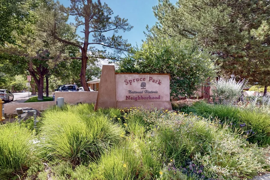 Nestled in the heart of Albuquerque's beloved Spruce Park neighborhood, this beautifully updated one-story ranch-style home blends timeless charm with modern comfort. Featuring 3 spacious bedrooms, 1 (full) & 3/4 baths, and multiple living spaces-including a formal living room, cozy den, and light-filled sunroom. Enjoy original red oak hardwood floors, cove ceilings, built-in features, and a striking mid-century fireplace that reflect the home's historic character. Updated chef's kitchen is a true standout, high-end appliances, generous storage, and functional layout designed for passionate cooks. The primary bath has been fully renovated with today's finishes in mind, and a new HVAC system (2023). Two-car GARAGE-rare for this area. Backyard, complete with a beautiful hardwood pergola.
