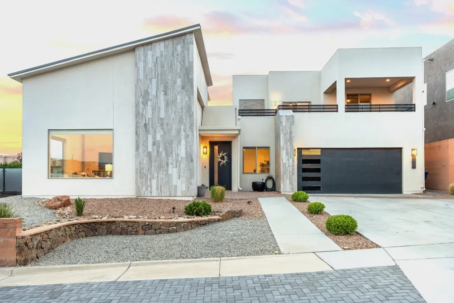 Perched on an elevated corner lot in the coveted Knolls of Paradise, this modern, custom-built home blends elegant, contemporary design w/ daily comfort! The gourmet kitchen w/ eat-in island/breakfast bar, stainless appliances, soft-close cabinetry & nice pantry. The interior boasts a modern fireplace, oversized picture windows, Hunter Douglas Silhouette blinds throughout & cove-lighting in the raised, coffered ceilings! TPO & metal roofs, tankless H2O heater & full-house water filtration system! Spacious main level primary w/ 2 private exterior access points, the primary bathroom has double sinks, makeup vanity, jetted tub, pass-through shower & a generously sized walk-in closet! Great loft area opens to an incredible view deck. Custom iron gates & privacy toppers, open patio spaces, low