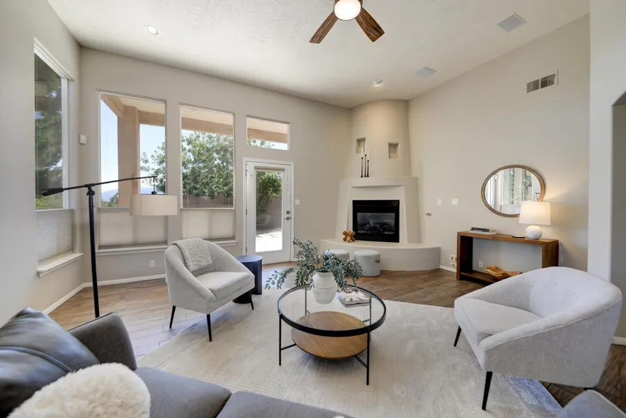 Inviting & Meticulous one level 3car garage home featuring Sandia Mountain Views in the desirable Stonebridge Community! Wonderful open floor plan with spacious rooms, abundant light & flexibility! Wood Beam Ceilings accent raised ceiling in the Great room showcasing the Kiva fireplace & patio doors to delightfully private east facing backyard. Open patio + custom Pergola for outdoor enjoyment and views! The gourmet kitchen is a chefs delight - the Beverly Blue Quartzite Granite Counters are breathtaking! A generously sized primary is awesome - custom closet system, deep soaking tub, double sinks, separate shower + the Beverly Blue Granite adds a luxurious touch! French doors to private study (nursey, gym/yoga. possibilities). Stonebridge offer 2 parks, walking trails and a pool - WOW! 10+