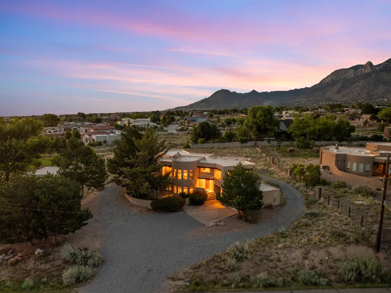 Set on nearly an acre in coveted North Albuquerque Acres, this custom residence blends architectural style with panoramic views of the Sandias and city skyline. Newer TPO roof. Interiors feature hardwood floors, soaring ceilings, skylights, recessed lighting, and ceiling fans, all enhancing the home's natural light and flow. The two-car garage and heated/cooled storage offer flexible space for a gym, workshop, or studio. A private lower level with two bedrooms, its own washer, dryer, and fridge, is ideal for in-law quarters. An upper patio off the kitchen invites al fresco dining with city light views. The backyard is a tranquil escape with covered and open patios, lawn, and mature trees.