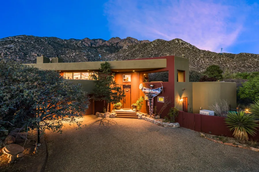 Absolutely breathtaking SANDIA HEIGHTS home with architectural detail & charming character throughout. Situated on a .93 acre lot offering PHENOMENAL 360 degree VIEWS! and stunning outdoor spaces. This home features 3/4 bedrooms, 4 baths, 3 living areas, (the family room complete with a Murphy bed) & formal dining. The island kitchen offers grantie/corian countertops, Sub-ero refrigerator, and abundant storage. The primary suie includes VIEWS, large walk-in closet, and luxurious bath. Very generous sized secondary bedrooms. 2-car garage w/storage & 220Voutlets. Enjoy Brazillian hardwood decking (wired for a hot tub), 4 fireplaces, hardwood floors upstairs, recent stucco (2023), tankless water heater & new septic (Oct 2025). Sellers will consider owner fininacing.