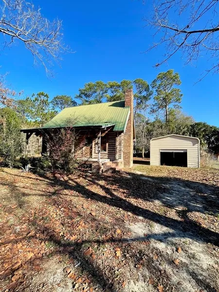Adorable Log Cabin nestled off the main street with private drive completely fenced private area. Brick fireplace, with wood floors, spiral staircase, brick floors in kitchen, large bath downstairs with claw foot tub, walk-in shower. Large backyard with grapevine, satsuma tree, and pecan tree along with a metal carport wired would make a great shop. Why rent when you can own!! Call Today
