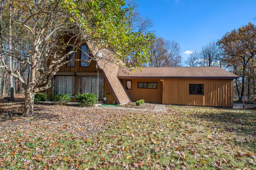 A peaceful, tranquility property close to Lake Michigan Beach Association. This offers two parcels at one price. The interior boasts beautiful Knotty Pine throughout the home and outdoors, surrounded by wooded and seasonal views of HARRIS LAKE. This gorgeous A-frame offers three bedrooms, two full baths, and an oversized 2-car garage. The Master Suite features a loft area overlooking the living room, and a French door leads to a private deck overlooking wood and nature. A stunning living room provides a rich tone of natural woods with a high ceiling, a cozy wood stove, and double sliders to the front porch, bringing every season to enjoy. The main floor has two bedrooms, one bath, a beautiful wood-tone dining area, and a slider to a large deck perfect for entertaining. Airbnb ready.