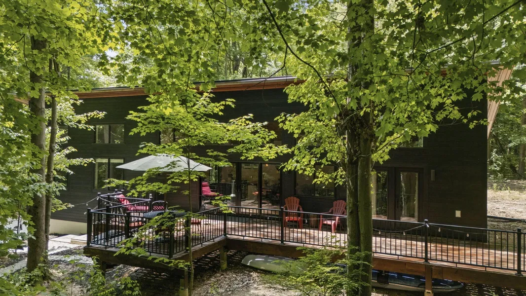 Set over 350 feet from the road down a winding drive is this gorgeous 3 years young, custom built home set on a private ravine in SW Michigan's wine country. Custom built with locally grown and milled lumber; fitted with custom finishes, solid hardwood floors, vaulted ceilings, and walls of glass. Featuring a spacious primary suite, large kitchen, open living/dining floorplan, main floor laundry; all with stunning views. Outside it's nothing but Big Deck Energy here with enough space to entertain a crowd! Soak in the hot-tub, build a fire in the firepit, all while soaking in the centuries old forested setting. Short term rentals are not allowed, 30 day minimum on rentals.