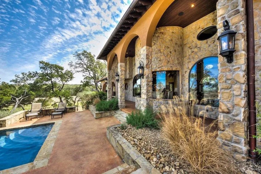 This warm and inviting estate reflects the owners' personalities and lifestyle. A very welcoming feel to the 6,000+/- square foot home with earthy and natural colors create an ambiance masterfully designed and constructed for anyones lifestyle and tastes. The Balcones Creek Ranch defines superior presentation and architecture offering its owner 3 living areas, dining room, entertainment bar, outdoor kitchen, 4 bedrooms, 4.5 bathrooms, 3 car attached garage, guest house, smoke house and 3-sided metal pole barn. This entertainment delight features inviting living spaces, hand carved stone fireplaces, huge picture windows to capture the expansive Hill Country views, a luxurious master bedroom design, a large open functional kitchen and breakfast area, an outdoor kitchen & entertainment retreat and incredible infinity pool with waterfall and heated spa. The property has over 370+/- feet of B...
