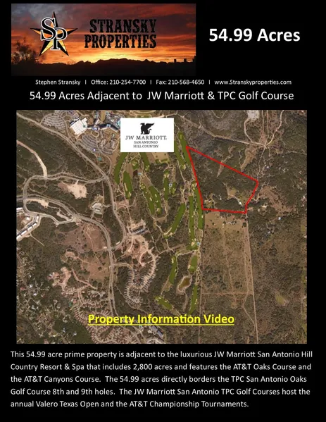 55 acres of very private secluded property sitting behind two privacy gates only 15 minutes from downtown San Antonio and adjoining the JW Marriott Hill Country Resort and TPC Golf Course on the 8th & 9th holes. The property also features a 3,000 sq. ft. home with a pool and cabana for guest, horse barn with lighted riding arena, and skeet shooting area.
