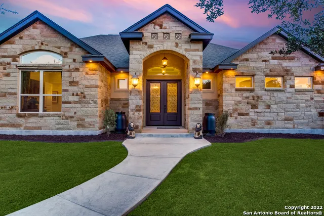 This marvelous, single-story home is situated on a generous-sized lot accessed by a private gated entrance. Upon arrival, a dedicated driveway is surrounded by mature shade trees and a well-manicured lawn. The stone and stucco exterior adds to the home's unique charm. Inside, neutral tile flooring is highlighted by elevated ceilings, picture windows, and more. Off the entry, a dedicated office space can be found, perfect for privacy. In the common areas, an open floor plan offers to entertain at ease. The living space showcases a built-in, wood-crafted entertainment center, perfect for movie nights, and provides stylish storage. Tray ceilings and views of the tree-shaded backyard complete this area. Flowing into the gourmet kitchen, the household chef will appreciate the espresso-colored cabinetry, contrasting granite counters, stainless steel appliances, stylish backsplash, and custom island with seating. Enjoy elegant dining in the grand living space with ample room for a bar or china cabinet. Retreat to the luxurious-sized primary suite with private access to the outdoors. The en suite offers dual sinks, a sit-down vanity, jetted tub, and a walk-in shower. Two secondary bedrooms and a full bath complete the interior. Outside, enjoy al fresco dining with a fireplace overlooking the extensive backyard, perfect for making this an oasis of your own. With proximity to Blanco Road, 281, eateries, and more, come view this stunning home today.