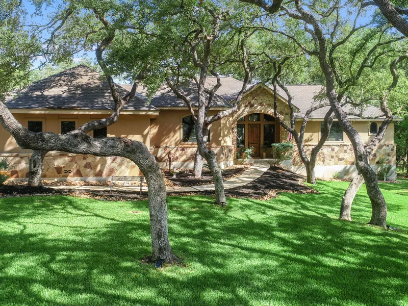 Exquisite one story home located on a 1.89 acre lot dotted with 220+ majestic oak trees in Garden Ridge Estates. Warm tones and custom architectural accents throughout highlight the open floor plan that is perfect for entertaining. Family room boasts stone fireplace and opens to kitchen and dining areas. Kitchen includes custom cabinetry, granite counters, stainless steel appliances, wide island with bar seating, and picture window for natural light. The primary suite offers outside access to patio, and spa like bath a walk-in shower with dual shower heads, natural light, and a walk-in closet with built-ins. The floor plan includes two spacious secondary bedrooms and a secondary bath that boasts custom vanity and dual sinks, a separate office, and exercise room. Exquisite laundry room offers outdoor access. Three car garage provides room for all of your vehicles and toys. The private backyard instills a feeling of calm with covered patio overlooking vast yard and mature landscaping. Conveniently located near Garden Ridge's Paul Davis Park that offers with community gardens, pavilions, sports and near The Club at Garden Ridge which offers swimming, tennis, and fitness activities.