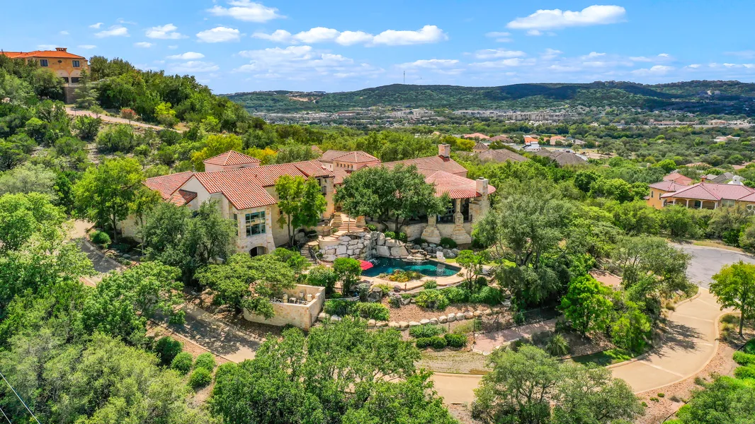 Unparalleled craftsmanship! Located on a 3.33+- acre hillside lot this perfectly situated home relishes the awe inspiring 180+ degree Texas Hill Country views from every room! This architecturally significant Dominion home is one-of-a-kind, and was designed by renowned architect, Roy Braswell, and built by master builder, Image Custom Homes. The finest appointments throughout are fit for the most discerning buyer. Grandeur open living space is appointed with vaulted ceiling, floor to ceiling stone fireplace and opens to dining room with doors opening to expansive covered patio. Entertainers dream kitchen with Sub Zero appliances, custom cabinetry, and large center island with breakfast bar, is adjoined by wet bar and separate caterers kitchen with extensive storage and secondary dishwasher. Primary suite offers outdoor access with its own covered patio and generous ensuite bath boasting natural stone elements, multiple vanities, built-ins, two closets, and soaking tub overlooking serene private yard. 3 secondary bedrooms are on the first floor, each with their own ensuite bath and breathtaking views. Spiral staircase leads down to entertainment level with game room, bar, full bath, and pool access. Impressive deep-water Keith Zars pool offers spa, multiple water features, diving ledge, and pristine flagstone decking providing ample poolside living space. Private drive, motor court, and three car garage provide ample room for all your toys.