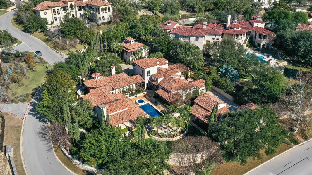World-class grounds await hidden behind large wrought iron gates and lined with mature trees brought in to provide unrivaled levels of privacy from the road. Poised for large-scale entertaining, this palatial Mediterranean estate is nothing short of spectacular. Privately gated and secluded on a corner lot, enter through the oversized double wrought iron gate to an expansive flagstone and in-laid brick motor court with ample space for guest parking. A separate guest apartment with private access off of Crescent Park features the same level of luxurious detail to include a living room, bar, and full bath down and an oversized guest suite up with vaulted ceilings, a sitting area, and an en suite bath. Step inside and be greeted by walls of floor-to-ceiling windows allowing for natural lighting to flood the interior, affording ample opportunity to relish in the gem's extraordinary appointments. From the gourmet chef's kitchen with a large beveled bullnose eat-in granite island to the family room with hand carved Cantera fireplace, every aspect of this home is grand in scale and bold in design. Indulge in the resort-style outdoor paradise with extensive stone and brick decking and hardscaping surrounding the spectacular hand-laid mosaic glass tile pool and jacuzzi with three tiers of entertaining space. Recently re-stucco of exterior throughout and refinishing of wood floors throughout. An unrivaled opportunity to enjoy an unparalleled lifestyle of seclusion, luxurious comfort, and lavish entertaining within the coveted guarded gates of The Dominion.