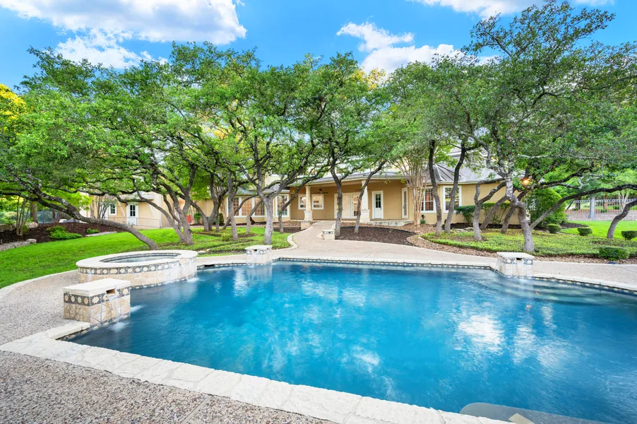 Welcome to this stunning home nestled in the picturesque neighborhood of Shavano Creek. Situated on a sprawling 1.34-acre cul-de-sac lot, this residence offers unparalleled space and tranquility. Upon entry into the grand foyer, you are greeted by an impressive spiral staircase, soaring ceilings, and a formal living room with a wet bar overlooking the picturesque and private backyard. Boasting five bedrooms and six bathrooms in the main house, this majestic home is ideal for both entertaining and everyday living. The expansive and completely remodeled kitchen features top-of-the-line appliances, including a Subzero refrigerator/freezer, two Bosch dishwashers, a built-in Bosch coffee maker, a Wolf warming drawer, double ovens, and a six-burner Wolf gas cooktop. The kitchen conveniently overlooks the recently renovated family room with surround sound, a fireplace, and expansive windows overlooking the resort-style backyard. The oversized bedrooms provide ample space for relaxation and include ensuite bathrooms and walk-in closets. The primary and secondary bedrooms are conveniently located on the ground floor as well. Upstairs, discover three additional bedrooms and a spacious game room, perfect for hosting gatherings or enjoying leisurely evenings. Step outside and be greeted by a breathtaking yard featuring a sparkling swimming pool, a well-lit sports court for recreational activities, and detached quarters spanning over 1,000 square feet. This separate living space includes two apartments totaling three bedrooms and two bathrooms, providing both privacy and versatility. Connecting the two apartments is a summer kitchen and a fireplace which creates a seamless indoor-outdoor living experience. The property also boasts a five-car garage, ensuring ample space for vehicle storage and hobbies. Additionally, enjoy approximately 1,076 square feet of space in the game room and storage room located above the garage, offering endless possibilities for utilization and enjoyment. With its luxurious amenities and expansive grounds, this home embodies the epitome of comfortable yet elegant living in the prestigious Shavano Creek community. Welcome home to a lifestyle of unparalleled luxury and relaxation.