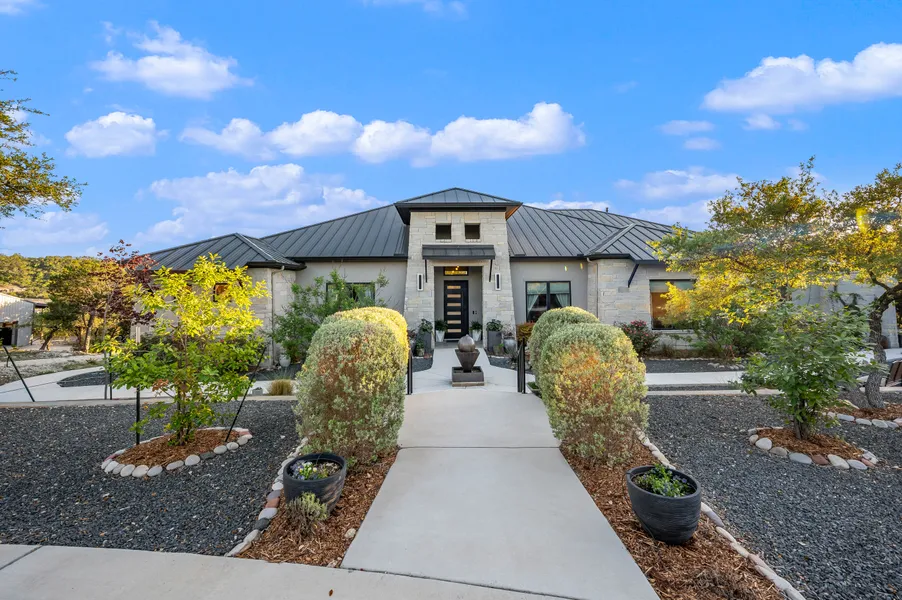 Perched atop 11 acres, this Sitterle Custom Home in Clearwater Ranch epitomizes clean, modern living with meticulous construction. Unsurpassed craftsmanship and materials harmoniously combine to create stunning living spaces with seamless indoor/outdoor integration. The residence is hand-selected with the finest appointments throughout, including custom ceiling and architectural details. The chef's kitchen is complete with custom solid wood Michael Edwards cabinetry, an oversized island with counter stool seating, professional-grade Thermador stainless steel appliances, and gas cooking. The master suite offers stunning views of the outdoor oasis, a luxurious spa-like bathroom, and His & Hers closets with extensive custom cabinetry and built-ins. All guest bedrooms are spacious and luxurious, each featuring en-suite bathrooms. Guests will enjoy the oversized game room with a full wet bar and pass-through to the patio. Designed for entertaining, the resort-style outdoor setting includes a premier pool with mosaic tile detailing and an oversized covered patio with multiple entertaining areas that overlook panoramic views of the Hill Country. The 1600 SF metal insulated storage building presents endless possibilities to be finished as a dream workshop, with water stubbed out at the front. The property affords for up to three more ancillary outbuildings to the main dwelling such as a guest house or casita up to 5,00sf. The property boasts immense privacy at the end of a cul-de-sac and is graced with beautiful sunrises and sunsets.