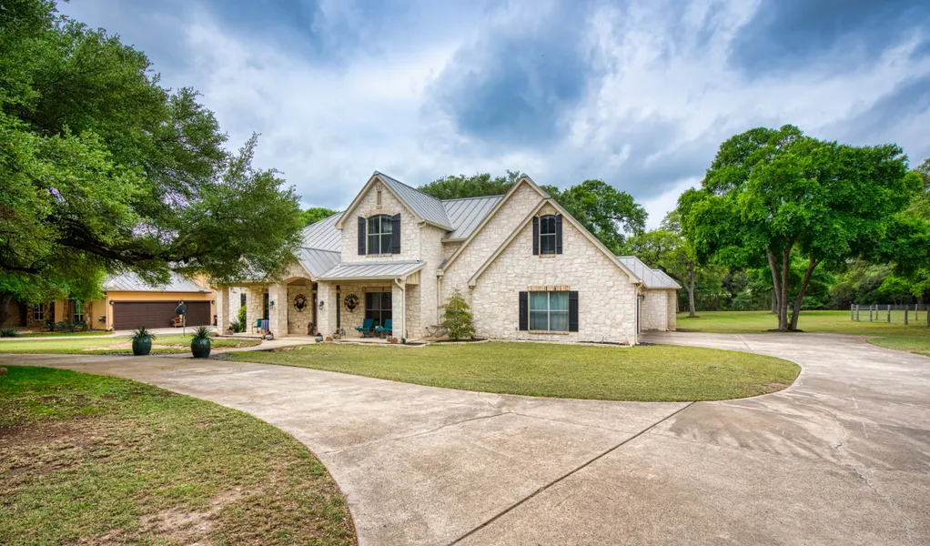 Welcome to Hill Country Living in Valentine Ranch, where this exquisite home on over an acre lot offers serene surroundings, mature trees and a creek in your backyard. The grand entryway, adorned with cedar wood ceilings and entry pillars, leads to a formal dining area and a versatile office space adjacent to the living room with views of the covered screened-in back patio and spacious yard. Two master suites on the main floor include one with a fireplace and access to the screened-in patio. The kitchen fea
