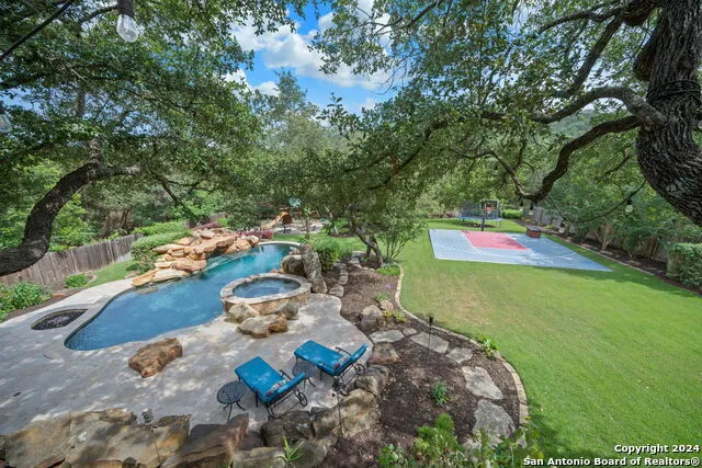 Step into luxury with this exquisite stone and brick home nestled among mature trees that provide both shade and privacy. The grand entryway with soaring high ceilings sets a majestic tone as you enter, enhanced by towering windows that bathe the home in natural light. The elegant curved staircase with its wooden and iron banister adds a touch of sophistication, leading you to an array of splendid living spaces. The living room, anchored by a fireplace that echoes the home's exterior, opens to the lush backyard, perfect for seamless indoor-outdoor entertaining. The chef's kitchen is a dream, featuring granite counters, a spacious island, and a sit-in bar that overlooks the living area. With two sunlit dining areas adorned with sparkling chandeliers, every meal feels like a special occasion. The massive primary suite offers a luxurious retreat with split vanities, a soaking tub, and a walk-in shower. Additional highlights include a home gym with elaborate ceiling details, a lofted game room with balcony views of the expansive backyard, a sparkling pool with a water feature and jacuzzi, a basketball half-court, and a playground. Complete with split garages for optimal storage and easy access to I-10, Friedrich Wilderness Park, upscale shopping, and more, this home is an unparalleled sanctuary near San Antonio's top attractions.