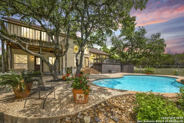 $10,000 SELLERS' CONCESSION for buyers' rate buy down or closing costs!! Price improvement & NEW AC and well pressure tank installed. Roof 1 year old. Welcome to your hill country dream home where privacy is paramount! This custom home sits on 2.5 acres in the desirable Country Place subdivision, offering proximity to amenities while being surrounded by nature. The open floor plan offers spectacular views from the breakfast area and the floor to ceiling windows in the living area invite the outdoors in. Come watch the deer play in the back that is studded with majestic oaks while listening to birds sing in the trees. You can have morning coffee or afternoon cocktails on the patio overlooking the stunning view. This home has 4 bedrooms and 2 1/2 baths, providing ample space. It can also function as a 3 bedroom home with a large game room. The primary bedroom is a haven set apart from the secondary bedrooms and offers wonderful views of the countryside from the private deck. The sparkling Keith Zars pool is a focal point and will encourage many days of family fun and relaxation. The neighborhood amenities include a clubhouse, pool, lighted tennis/pickle ball court, basketball court and riding trails. The low HOA is an added plus. Bring your RV or Boat to park in the back and horses are allowed, so saddle up! From its tranquil setting to its unique design this estate offers a lifestyle of peace and privacy.