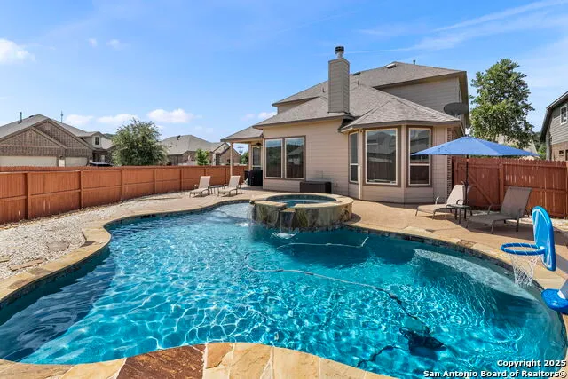 Sophistication and comfort meet in this stunning 4-bedroom, 3.5-bathroom home nestled on a beautifully landscaped corner lot in Helotes. Designed for both everyday living and elegant entertaining, the grand open layout features soaring ceilings, abundant natural light, and striking curb appeal that instantly captures attention. Inside, the spacious kitchen is a chef's dream-complete with stainless steel appliances, an inlay gas stove, built-in microwave and oven, ample cabinetry, generous countertop space, and a large island perfect for gatherings. The formal dining room and cozy living area with a fireplace make hosting effortless, while the dedicated office provides a quiet space to work from home. Retreat to the luxurious primary suite featuring a spa-like en suite bathroom with dual vanities, a soaking garden tub, and a separate walk-in shower. Upstairs, enjoy a loft area, media/movie room, and built-in desk-ideal for homework, planning, or creative projects. Step outside to your private xeriscaped oasis. A shimmering pool with a spa, spacious covered patio, and lush greenery offer a peaceful retreat or the perfect backdrop for summer get-togethers. Situated just north of Highway 16/Bandera Road, this home combines a relaxed country lifestyle with convenient access to shopping, dining, and top-rated schools in a rapidly growing area. Experience luxury living with space to unwind, entertain, and truly feel at home.