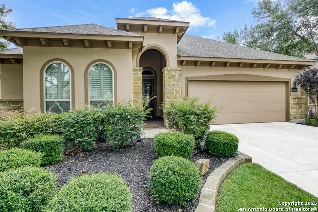 Enjoy upscale living in this beautifully upgraded home, located in a gated community with a clubhouse, party room, and walking paths. Inside, high ceilings, rock wall accents, wall niches, and Plantation shutters add elegance, while the chef's kitchen features gas cooking, built-in refrigerator, wine fridge, and expanded eat-in space. The extended back patio and full outdoor kitchen with built-in BBQ grill and smoker overlook a private greenbelt-ideal for relaxing or entertaining. Recent updates include a new roof (July 2025) and freshly painted exterior. Added curb appeal comes from the widened driveway, and the HOA takes care of front lawn maintenance weekly for easy living.