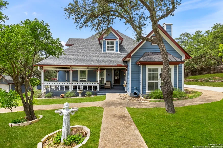 Welcome to this stunning Victorian-style home, masterfully crafted by the renowned Diamante Custom Homes, nestled in the charming city of Boerne, TX. This exquisite two-story residence sits gracefully on a sprawling 1.576 -acre lot, offering both privacy and ample space for outdoor enjoyment. As you approach, a private, secured gate and a circular driveway create a grand first impression, leading you to the inviting wraparound front porch, the perfect spot to relax and soak in the scenic surroundings. Step inside to discover a spacious, thoughtfully designed layout. The eat-in kitchen provides a warm setting for casual meals, while the separate formal dining room is ideal for hosting elegant gatherings. Rich oak hardwood floors paired with durable ceramic tile flow seamlessly throughout the home, ensuring a stylish, low-maintenance living space free of carpet. The living room and primary bedroom both feature soaring high ceilings, enhancing the sense of openness and grandeur. The cozy living area exudes charm and comfort, an inviting space for family and friends to gather. A striking Victorian rose stained glass window adds an artistic, timeless touch to the primary bath, which also boasts a luxurious soaking tub with jets, perfect for unwinding at the end of the day. Generously sized bedrooms offer plenty of room for relaxation and privacy. The home's exterior is equally captivating, highlighted by a distinctive banana peel copper roof, a unique feature that adds character, style, and durability, gracefully developing a rich patina over time. Completing this exceptional property is a detached garage, providing convenient parking and extra storage space. Perfectly positioned just minutes from IH-10, this home offers effortless access to the San Antonio Rim shopping center as well as the quaint shops and dining experiences of Downtown Boerne. It also falls within the highly acclaimed Boerne ISD. Don't miss your chance to own this extraordinary blend of Victorian elegance, modern comfort, and prime location. Schedule your private tour today and experience the charm of Boerne living!