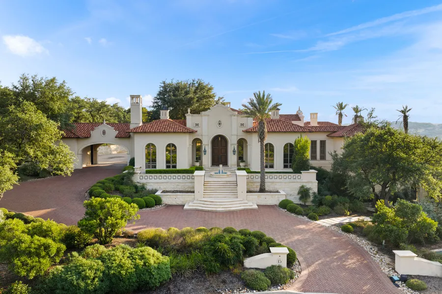 Nestled on 1.26 acres in the prestigious gated community of The Dominion at 15 Paseo Valencia, this custom-built Mediterranean-style estate offers an unparalleled living experience in one of San Antonio's most sought-after neighborhoods. Known for its breathtaking landscapes, world-class golf course, and vibrant yet private community, The Dominion provides both tranquility and convenient access to the city's finest dining, shopping, and entertainment. This grand estate is a testament to sophisticated design and impeccable craftsmanship, featuring a stunning exterior with a classic red-tiled roof, stucco finishes, and beautiful arched windows. Perfectly positioned on its expansive lot, the home captures the natural beauty of the surrounding hills, offering panoramic views from nearly every room. Inside, the home exudes elegance and warmth. The main living area boasts soaring vaulted ceilings with exposed wooden beams, four fireplaces, and walls of windows that flood the home with abundant natural light, creating a seamless connection to the outdoors. The formal living and dining rooms are perfect for entertaining, while the dedicated movie theater, spacious office, and climate-controlled wine cellar elevate the lifestyle experience. A separate caterer's kitchen adds unmatched convenience for hosting large gatherings. The luxurious master suite is a private retreat featuring his and her spa-like bathrooms and oversized walk-in closets. With five spacious bedrooms in total, each with its own walk-in closet, the home offers both privacy and comfort for family and guests. The outdoor spaces are designed as an entertainer's paradise. A terraced yard flows into an infinity-edge pool with a hot tub that seamlessly spills over into the water, overlooking breathtaking views of the Texas Hill Country. Multiple lounging areas provide the perfect setting for relaxation or gatherings under the open sky. A paved driveway offering ample parking leads to both an attached two-car garage and an additional detached two-car garage. This exquisite Dominion estate is more than a residence-it is a sanctuary of comfort, elegance, and timeless design