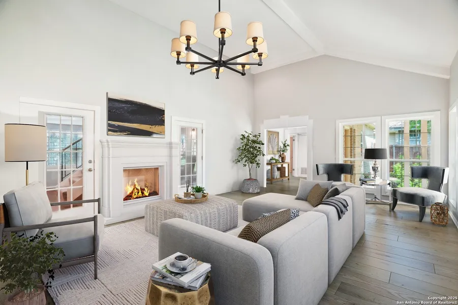 Set on nearly a quarter-acre in a highly sought-after, guarded and gated community, this beautiful 1.5-story home offers comfort, character, and versatility in a serene setting. A perfectly manicured yard framed by mature oak trees welcomes you, along with a breezy front porch, setting the tone for this residence. Step into the light-filled entryway, thoughtfully designed to separate the private primary suite from the rest of the home. To the left, you're greeted by a bright and airy living room with a vaulted ceiling and a cozy fireplace. Just off the living room is a generously sized flex room, offering versatility as a second living area, office, media or game room. As an added feature, a staircase leads to a private loft above, perfect as a creative space, hobby area, or personal library. The heart of the home flows from the main living area into a formal dining room, then into the breakfast room, adjoined to the kitchen - creating an ideal gathering space. The kitchen features solid wood cabinetry, tiled countertops, a gas stovetop, and a charming window over the sink - a functional and inviting space for everyday living. Three well-sized secondary bedrooms and a spacious full bathroom are located in their own wing, offering privacy and comfort for loved ones or guests. On the opposite side of the home, the primary suite is a true retreat, complete with a vaulted ceiling, large walk-in closet, and a beautifully appointed bath featuring a double granite vanity, walk-in shower, adaptive garden tub, and plenty of storage. The backyard is equally impressive with a covered patio, additional paved area, pergola with swing, and a lush landscape full of vibrant foliage - ideal for relaxing and entertaining. With close proximity to Loop 410 and access to all the conveniences of North San Antonio, this home offers the perfect blend of peaceful living and everyday practicality.