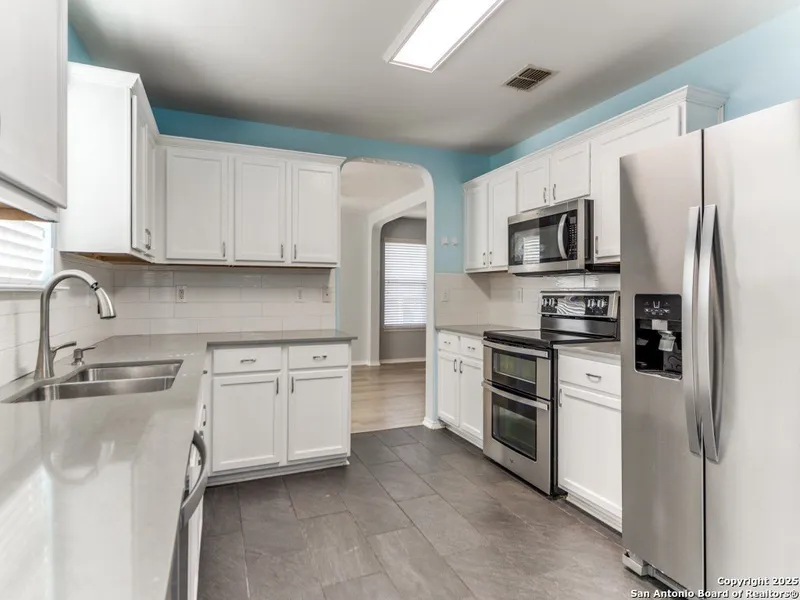 Sleek on-trend updates in this light and bright 3 bedroom home in the North Central San Antonio neighborhood of Wildhorse just outside Loop 1604 near UTSA, Valero, The Rim, and the Medical Center! Upstairs family room! Peaceful grey walls and lovely wood-look luxury vinyl plank and ceramic tile flooring throughout. White blinds and designer Hunter ceiling fans make it cool and comfortable. Oversized tile in the kitchen and adjacent breakfast area accents the white tile backspash with quartz counters and white-washed cabinets. The upstairs primary suite offers a garden tub and a separate shower and is complete with dual vanities and classy oversized rectangular linen-look ceramic tile. A sunny and spacious upstairs gameroom offers a second living area with lots of versatility. The big backyard has a covered patio, firepit, bbq grill and a playscape that all convey with the home. The garag...