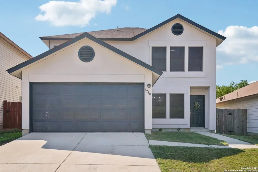 Welcome to this beautifully refreshed home in the ever-popular Dover subdivision. With a freshly painted exterior (August 2025) in modern, eye-catching colors, this stucco beauty makes a crisp and stylish first impression that radiates curb appeal! Step inside to discover an open floor plan with quality vinyl flooring throughout-no carpet anywhere! Not only does this make accidental spills a breeze to clean, it's a dream for those with pets, kids, or allergies. Just off the entry, a formal dining area sits at the front of the home, basking in natural light from two large windows and anchored by a modern light fixture. This space flows seamlessly into the main living room and onward into the spacious kitchen, creating a natural hub for dining, entertaining, and everyday living. The kitchen features a stainless steel refrigerator (included in the sale), ample cabinet and counter space, and cabinets with a natural oak look that add warmth to the modern design. Sliding glass doors offer access to the backyard, and the thoughtful floor plan makes it easy to move between living spaces-whether through the main entryway or the hall that connects to the half bath and laundry room. The laundry room offers garage access, giving you a practical mudroom-style space for backpacks, shoes, and work gear before heading into the home. Upstairs, you'll find all three bedrooms conveniently located together. The primary suite is spacious and welcoming, with a full ensuite bathroom featuring a tub/shower combo, single-sink vanity with a makeup table, and a walk-in closet. Two additional bedrooms share another full bath, providing comfort and flexibility for family or guests. Out back, the large yard offers plenty of room for outdoor fun. While not officially on a greenbelt, a line of mature trees behind the property creates shade, privacy, and a welcome reprieve from the Texas sun-plus, you're not backing up directly to another home! Practical updates bring peace of mind, including a new AC unit and heat pump (March 2025)! Located just minutes from Randolph Air Force Base, Fort Sam Houston, 1604, I-35, and I-10, this home ticks all the boxes!